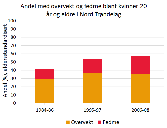 Andelen voksne som har overvekt og fedme har økt i perioden vi har målinger fra, siden midten av 1980-tallet og fram til i dag. Økningen var sterkest fram til rundt 2008, deretter har økningen bremset noe opp fram til 2016/2019 . Dette forklares ved at andelen som har fedme har økt, mens andelen som har overvekt synes å være mer eller mindre stabil. Dette viser høyde- og vektmålinger av befolkningen i Tromsø og Nord Trøndelag.