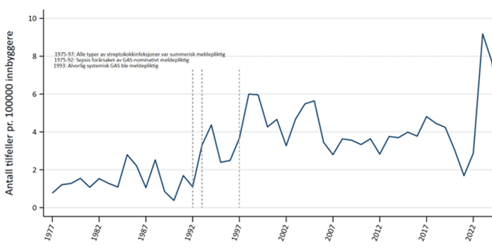 I desember 2022 ble det rapportert om økt forekomst av invasive GAS-infeksjoner (iGAS) hos barn under 10 år i flere land i Europa (ref 1). Og i Norge fikk FHI vinteren 2023 meldt flere invasive GAS-infeksjoner til MSIS enn det som ble meldt i årene før covid-19 pandemien. Økningen var tydeligst etter nyttår og blant barn under 10 år. Det ble også rapportert perioder med økt forekomst av invasive GAS-infeksjoner hos voksne og eldre vinteren 2023 sammenlignet med årene før covid-19 pandemien. Forekomsten var på topp i mars og noe forhøyet fram til sommeren 2023, særlig hos de yngste aldersgruppene.
