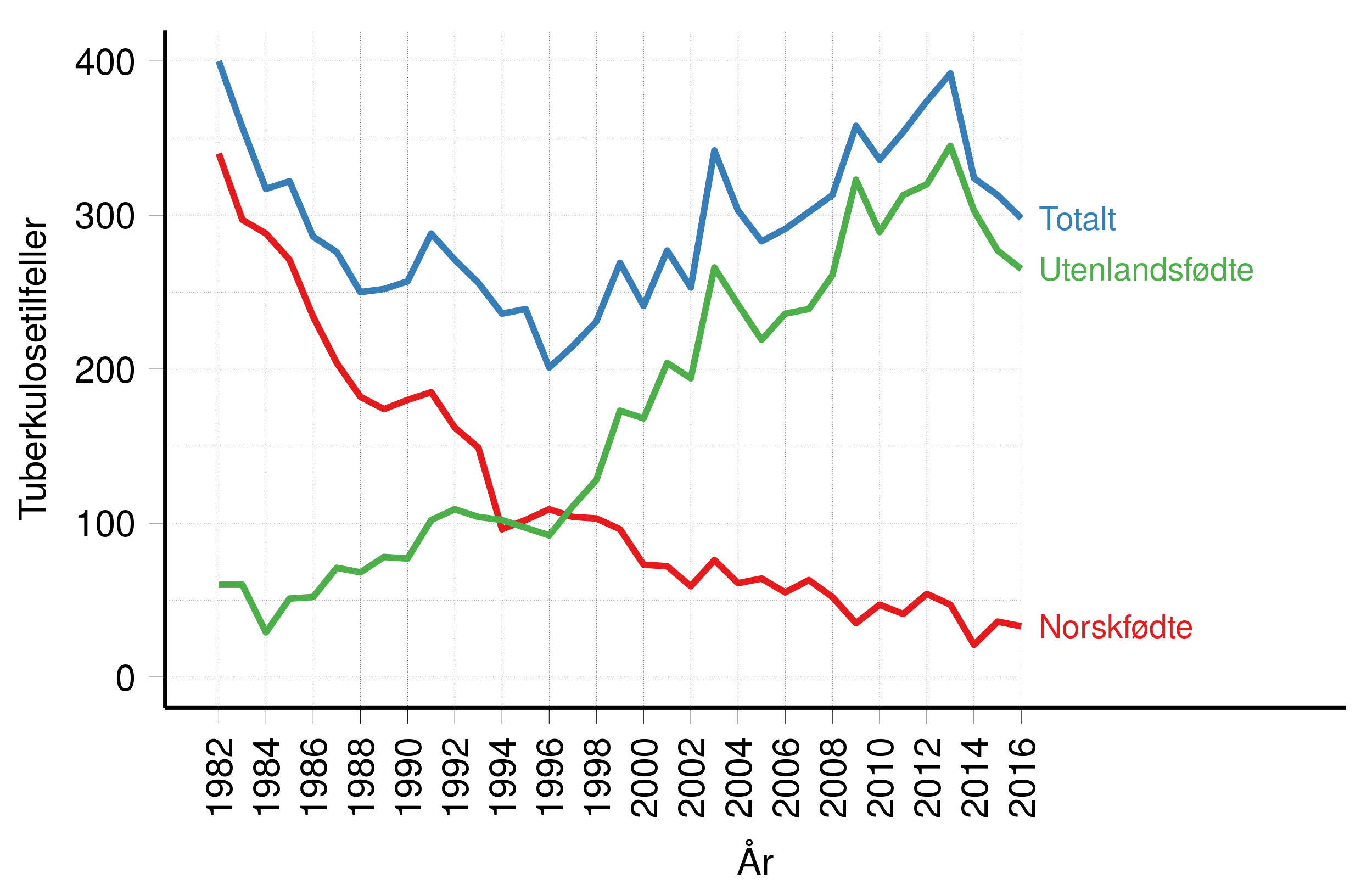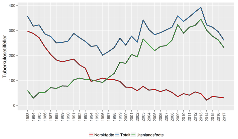 I 1996 ble det meldt 201 tilfeller av tuberkulose her i landet, hvilket er det laveste antallet som er meldt så lenge man har overvåket tuberkulosetilfeller i Norge. Etter 1996 var det en jevn stigning i forekomst av tuberkulose i Norge fram til en foreløpig topp i 2013 med 392 meldte tilfeller (MSIS). Dette skyldtes hovedsakelig nye tilfeller hos personer som kom til Norge fra land med høy forekomst av tuberkulose. Deretter er antallet gått ned igjen de siste årene, til 209 i 2018. Antallet tilfeller blant norskfødte har fortsatt å gå ned. Genetiske undersøkelser av tuberkulosebakterier i Norge (”fingeravtrykksundersøkelser”) tyder på at det store flertallet blant disse utvikler tuberkulose på grunn av reaktivering av gammel smitte, mens under 20 % av tilfellene skyldes nysmitte (Farah et al., 2005; Heldal et al., 2000). Økt andel utenlandsfødte tuberkulosepasienter har ikke ført til økt andel nysmitte i Norge (Dahle et al., 2007).