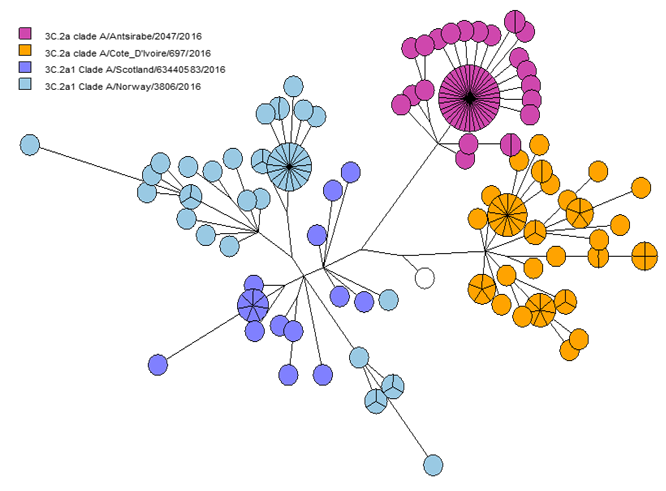 I tillegg til at flere virus kan være representert innenfor én influensasesong, kan man også se en del variasjon innenfor den enkelte subtypen. Denne utfordringen er særlig til stede når det dominerende viruset er A(H3N2), ettersom dette viruset har en særlig høy endringstakt. Figur 3 viser variasjon i påviste influensa A(H3N2) i Norge for sesongen 2016/17. I denne sesongen var to hovedgrupper av H3N2 virus i sirkulasjon: 3C.2a og 3C.2a1. Disse kan videre inndeles i undergrupper. Undergrupper av 3C.2a er fargekodet i rosa og gult, og undergrupper av 3C.2a1 er fargekodet i lyseblått og mørkeblått.