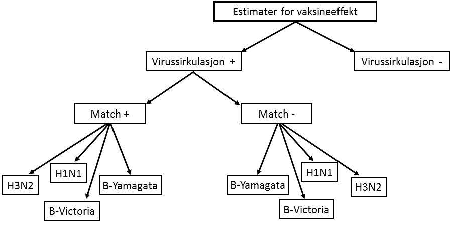 En viktig forutsetning for effektstudier er at det sirkulerer virus i studieperioden. Darvishian et al. (2014) viste på bakgrunn av effektestimater fra TND-studier (jfr tabell 2) at vaksinen gir beskyttelse ved både match og mismatch i sesonger med sirkulerende virus, men at det ikke er mulig å påvise en beskyttende effekt på befolkningsnivå i sesonger med kun lokal, sporadisk eller ingen influensasirkulasjon (35). Selv om vaksinen kan beskytte enkeltindividet i perioder med lite virussirkulasjon, vil effekten ikke være målbar på befolkningsnivå på grunn av få sykdomstilfeller. Når data skal sammenstilles er det derfor viktig at studiesesonger uten tilstrekkelig virussirkulasjon analyseres for seg.