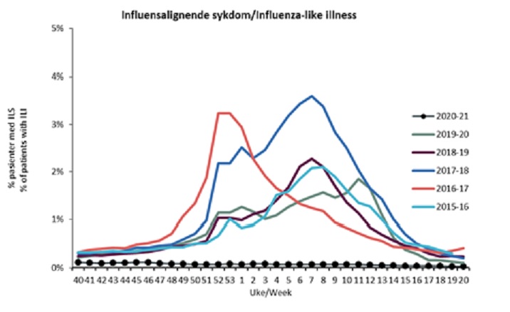 Influensaovervåkingen ved Folkehelseinstituttet har pågått siden 1950-tallet, og er med det den overvåkingen som har pågått lengst i Norge. Slik overvåkingen er utformet i dag, er den basert på henholdsvis antall influensarelaterte konsultasjoner i allmennpraksis og legevakt (andel pasienter med influensalignende sykdom, ILS) gjennom NorSyss, og virusprøver fra pasienter i sykehus og primærhelsetjeneste ved den laboratoriebaserte overvåkingen. Den laboratoriebaserte virusovervåkingen foregår året rundt, mens overvåkingen av influensarelaterte legekonsultasjoner er begrenset til selve influensasesongen, som på den nordlige halvkule er definert til perioden fra uke 40 til uke 20 – altså oktober til mai (10).