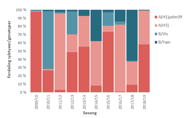 I Norge faller influensasesongen vanligvis innenfor perioden november til mars, med utbrudd som gjerne begynner i førjulstiden og varer omtrentlig 6-8 uker, noen ganger lenger. De siste 10 årene har influensatoppen kommet enten rundt nyttår eller i forbindelse med vinterferien rundt uke 8 (figur 1). Hvilke virustyper som dominerer varierer for hver sesong. Flere influensavirus kan sirkulere på samme tid; da er ofte ett virus mer utbredt i starten av sesongen, mens et annet tar over mot slutten. Det er sjelden at et virus som har dominert én sesong også dominerer sesongen etter (jfr figur 2).