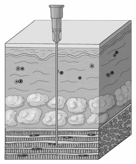 Figur 2. Injeksjonsdybde (ill. Kari C. Toverud CMI (sertifisert medisinsk illustratør)