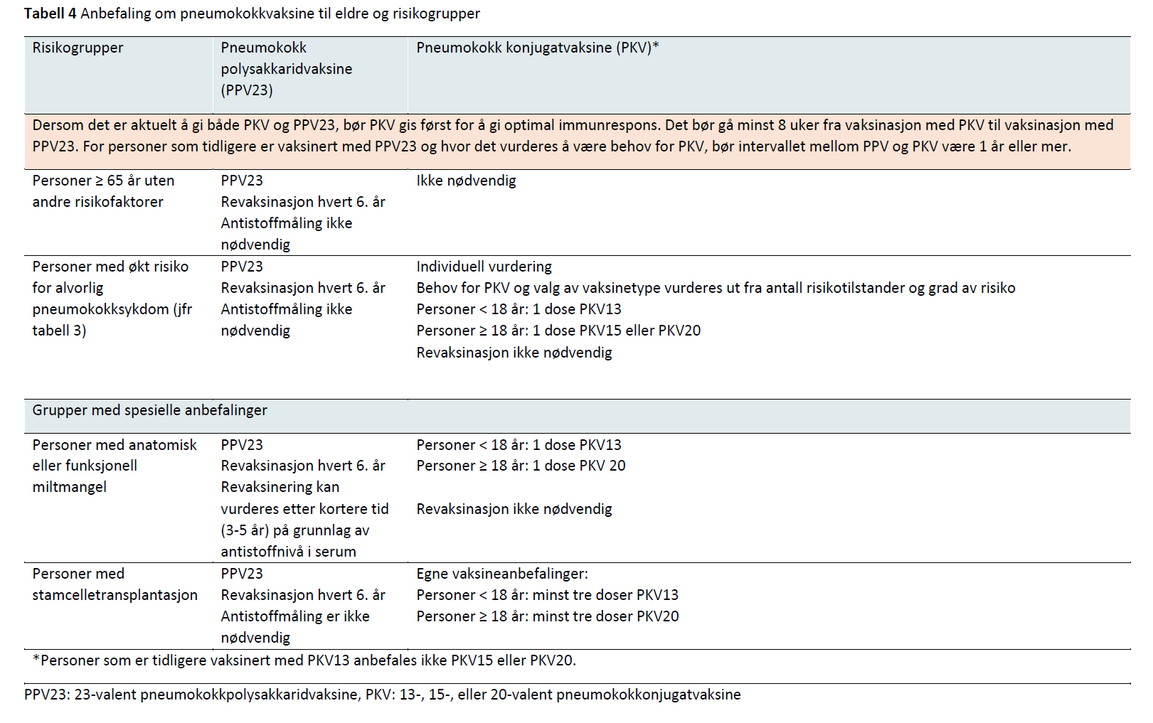- Personer ≥ 2 år i risikogruppene som vurderes å ha behov for pneumokokkvaksine bør som hovedregel tilbys enten PPV23 (Pneumovax) eller PKV20 (Prevenar 20), eller PKV21 (Capvaxive).