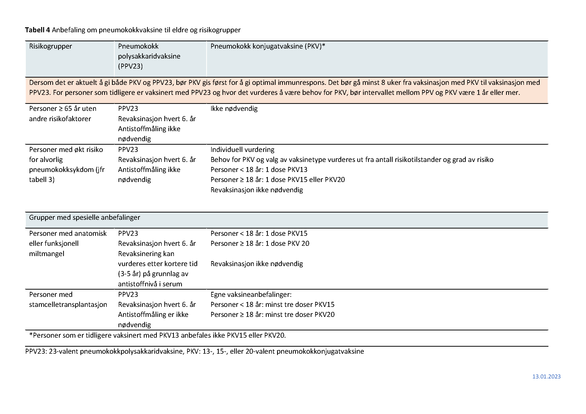 Dersom PPV23: Revaksinasjon hvert 6. år. Antistoffmåling ikke nødvendig. Dersom PKV20 eller PKV21: Revaksinasjon ikke nødvendig. Antistoffmåling ikke nødvendig.