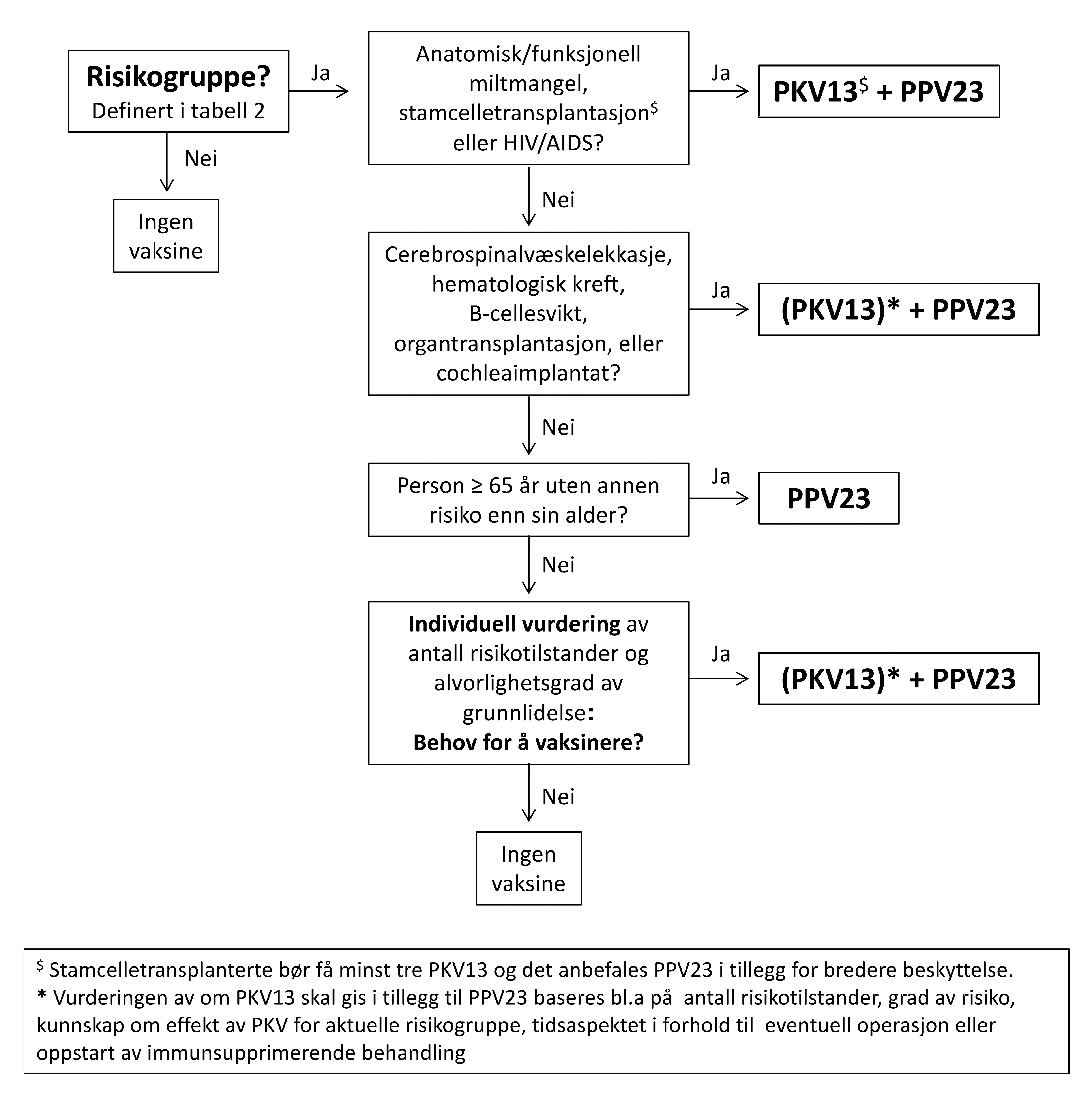 - Personer ≥ 65 år uten andre risikofaktorer bør tilbys enten PPV23 (Pneumovax) eller PKV20 (Prevenar 20) eller PKV21 (Capvaxive).