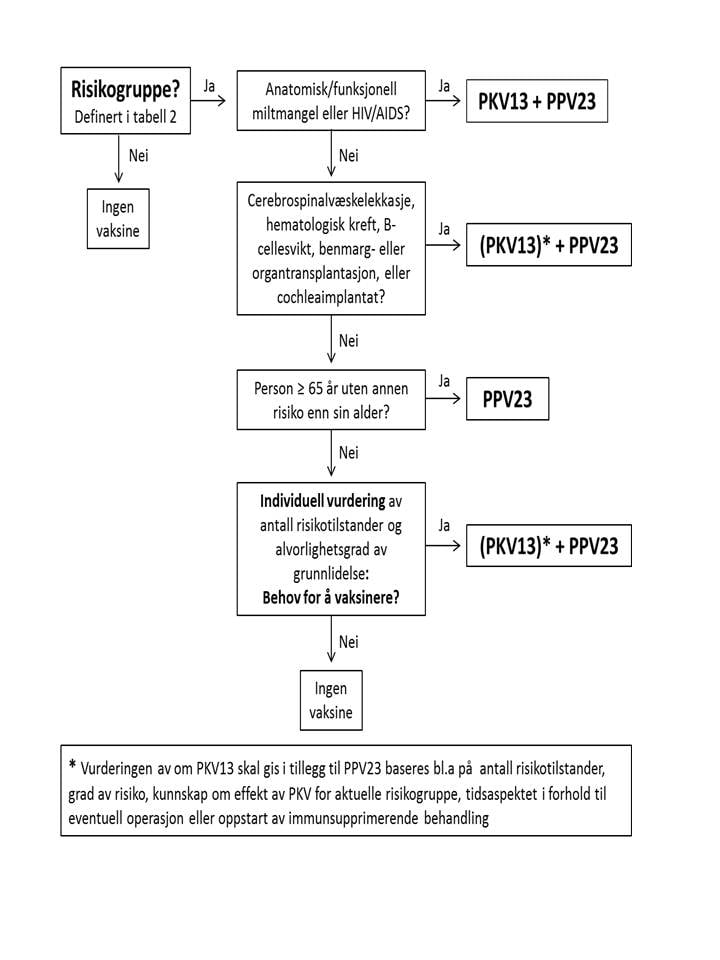 - Personer ≥ 2 år i risikogruppene som vurderes å ha behov for pneumokokkvaksine bør som hovedregel tilbys enten PPV23 (Pneumovax) eller PKV20 (Prevenar 20), eller PKV21 (Capvaxive).