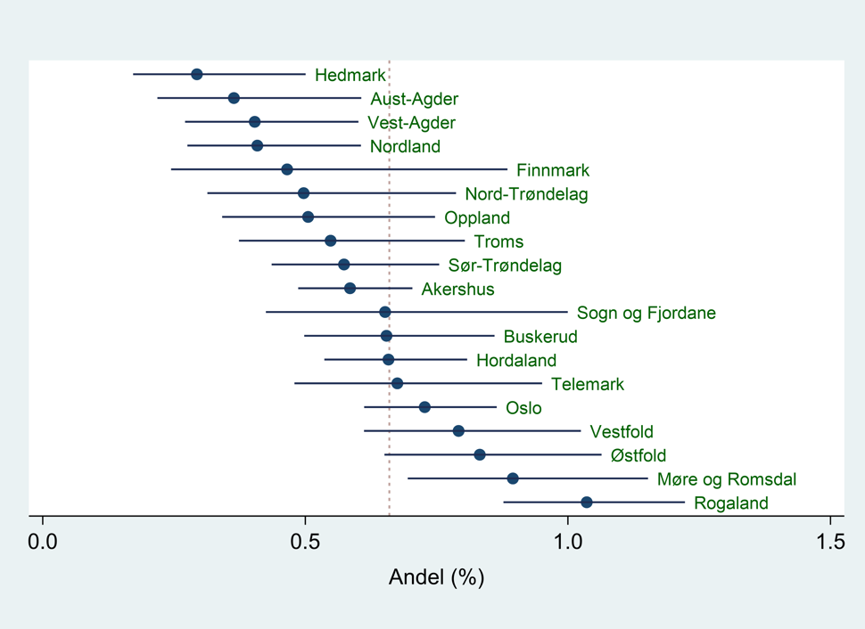 - Hedmark, Aust-Agder, Vest-Agder og Nordland låg under landsgjennomsnittet.