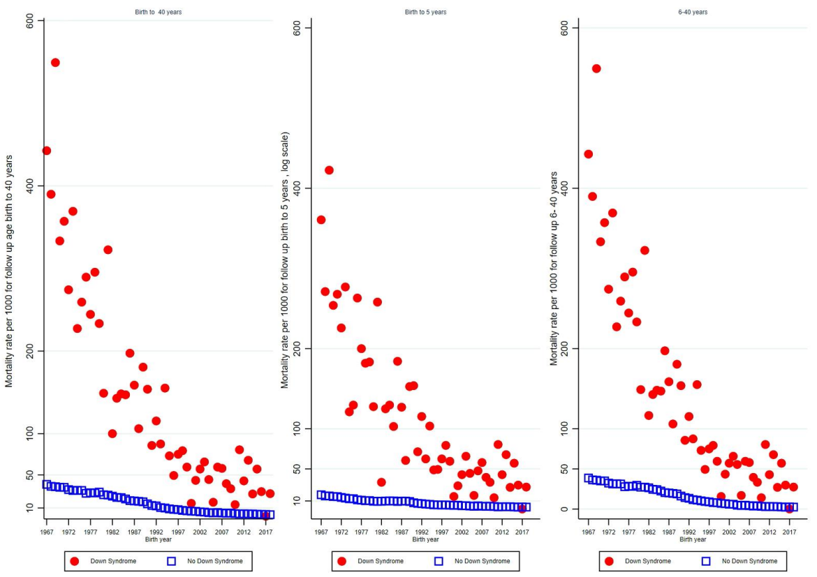 Blant personer med Downs syndrom var dødeligheten før fylte 40 år gjennomgående høy i alle fødselskohorter fra 1967 til 2018. Dødeligheten varierte i denne perioden mellom omtrent 14 og 549 per 1 000. Den høyeste dødeligheten ble observert frem til begynnelsen av 1990-tallet. Til sammenligning var dødeligheten i samme aldersgruppe blant personer uten Downs syndrom lav og relativt stabil i samme periode, på rundt 2 til 39 per 1 000.