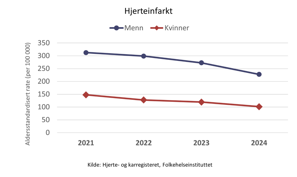 Ta meg til forsidenI perioden 2021 til 2024 var det en fortsatt nedgang i nye tilfeller for hjerteinfarkt og hjerneslag. For hjertesvikt lå antallet stabilt i samme periode.