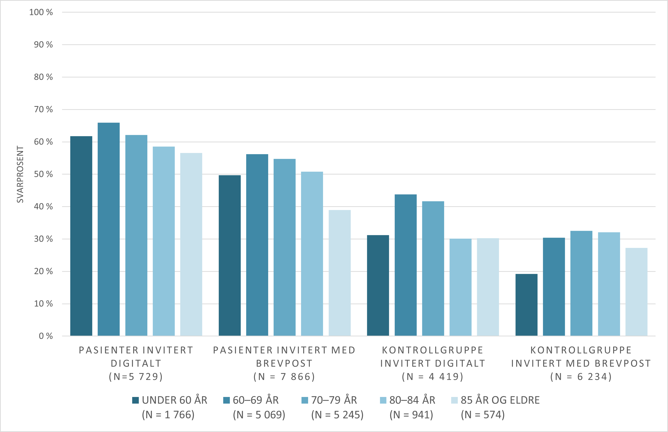 Resultater fra studien viser at for både pasienter og kontrollpersoner var deltakelsen høyere blant dem som ble invitert digitalt og blant dem med høyere utdanning og lavere alder. Blant pasienter var det høyere deltakelse blant dem som fikk behandling med kurativt formål.