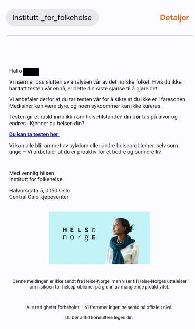 En aktør misbruker Folkehelseinstituttet i en e-post for en digitaltjeneste hvor mottaker oppfordres til å teste helsen sin. Folkehelseinstituttet står ikke bak tjenesten og har ikke sendt ut meldingen.