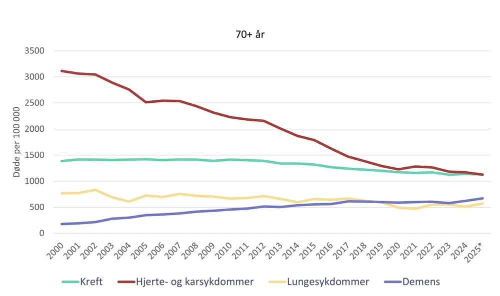 Kreft, hjerte- og karsykdommer og demens var de tre største dødsårsakene i 2025 ifølge nye tall fra Dødsårsaksregisteret ved FHI.