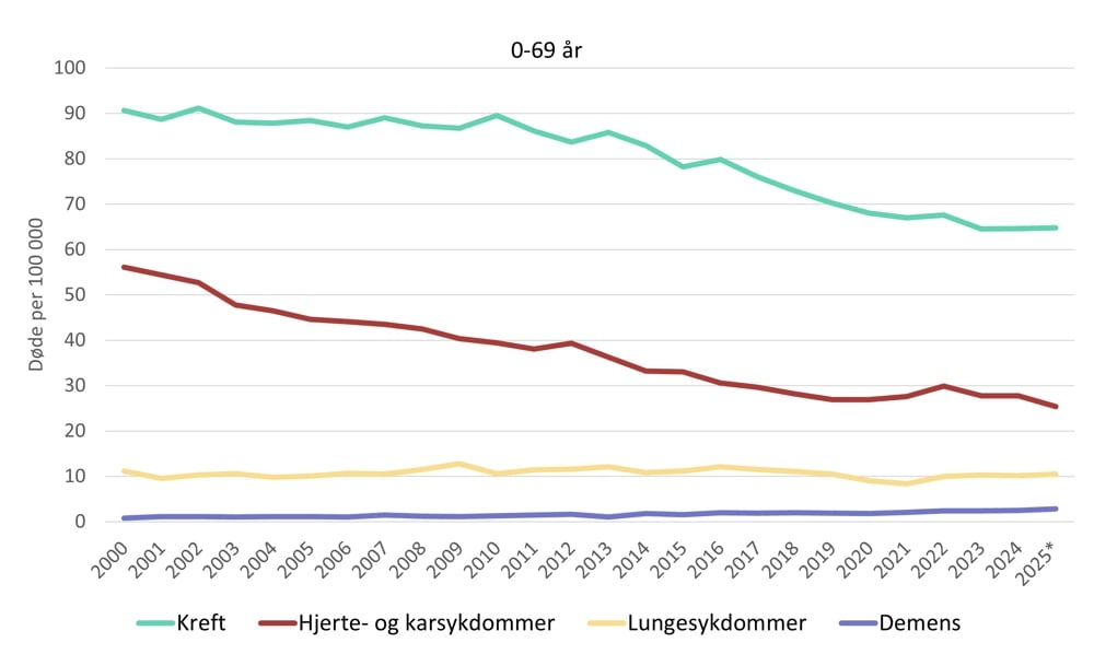 Kreft er den dominerende dødsårsaken og de siste årene har den årlige raten ligget stabilt. Utviklingen viser likevel et betydelig fall i dødelighetsraten av kreft gjennom de siste femten årene. Dødelighetsraten av hjerte- og karsykdommer har også falt betydelig siden årtusenskiftet, men ikke i like raskt tempo som hos de over 70 år.