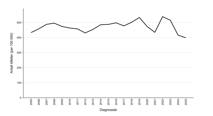 Figur 2. Antall meldte tilfeller av klamydia per 100.000 innbyggere, 2005 – 2025. Kilde: MSIS, FHI.