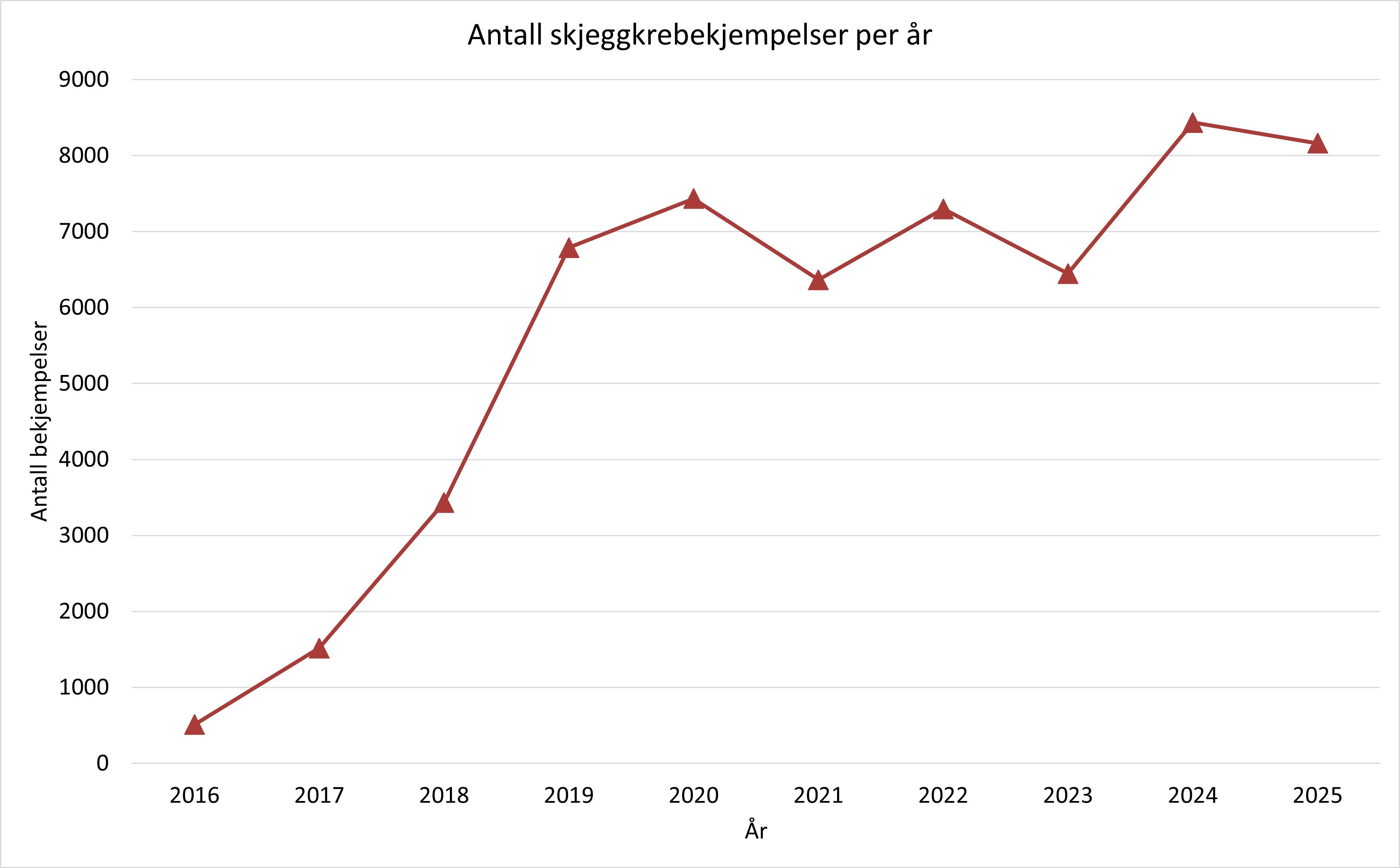 Statistikken for 2025 viser at talet på veggedyroppdrag aukar litt frå 2024, frå 2421 til 2650. Tal for 2025 er likevel lågare enn tala for den høgaste perioden i 2016–2019, då det var rundt 3000 bekjempingelser årleg.