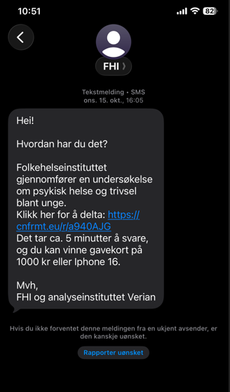 Vi gjennomfører for tiden en spørreundersøkelse i samarbeid med analyseinstituttet Verian. Invitasjon til undersøkelsen er sendt ut på sms, der avsender er FHI. Målgruppen er ungdom mellom 16-25 år.
