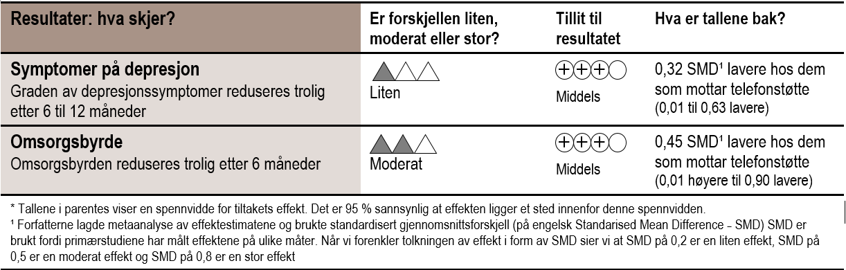 Vi vet ikke hvilken effekt telefonstøtte har på opplevd sosial støtte, angst, mestringstro, livskvalitet, uro (‘distress’ på engelsk) og tilfredshet, fordi funnene er usikre og mer forskning er nødvendig.