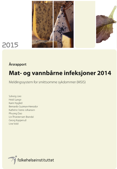 Næringsmiddelbårne infeksjoner og utbrudd i 2014. Rapporten beskriver forekomsten av de vanligste mat- og vannbårne infeksjoner rapportert til Folkehelseinstituttet i 2014. Det totale antall meldte tilfeller av mat- og vannbårne infeksjoner i 2014 økte svakt i forhold til året før.