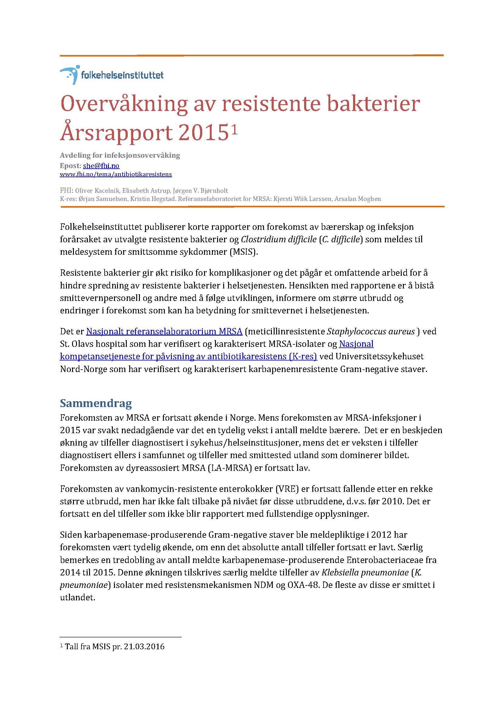 Overvåkning av resistente bakterier - Årsrapport 2015