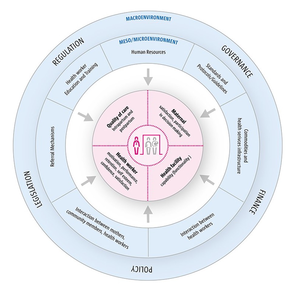 - Menneskelige ressurser. Mangel på helsepersonell (inkludert helsepersonell med nøkkelkompetanse) påvirker negativt evnen og muligheten til å gi god behandling og oppfølging innen fødsel- og barselomsorgen (middels tillit til resultatet). For eksempel beskriver helsepersonell hvordan høy arbeidsbelastning kan føre til at pålagte rutiner som å innhente sykehistorie, å gjøre grundige undersøkelser av de fødende kvinnene, god håndvask og bytte av hansker blir droppet og at de ikke rekker å ta hensyn til kvinnenes behov, blant annet behovet for kvinnens privatliv. Dårlig lønn og insentiver påvirker negativt evnen og muligheten til å gi god behandling og oppfølging innen fødsel- og barselomsorgen (middels tillit til resultatet). For eksempel føler ikke helsepersonell at deres lønn gjenspeiler de oppgavene de utfører og den risikoen de påtar seg. De arbeider også ofte alene og har lange arbeidsdager. Lange avstander og dårlige boforhold gjør at de av og til må bo langt fra ektefeller og barn eller at de bor under vanskelige forhold. Sammen med de dårlige arbeidsforholdene kan disse problemene fører til frustrasjon og stress og går av og til utover familielivet til de ansatte.
