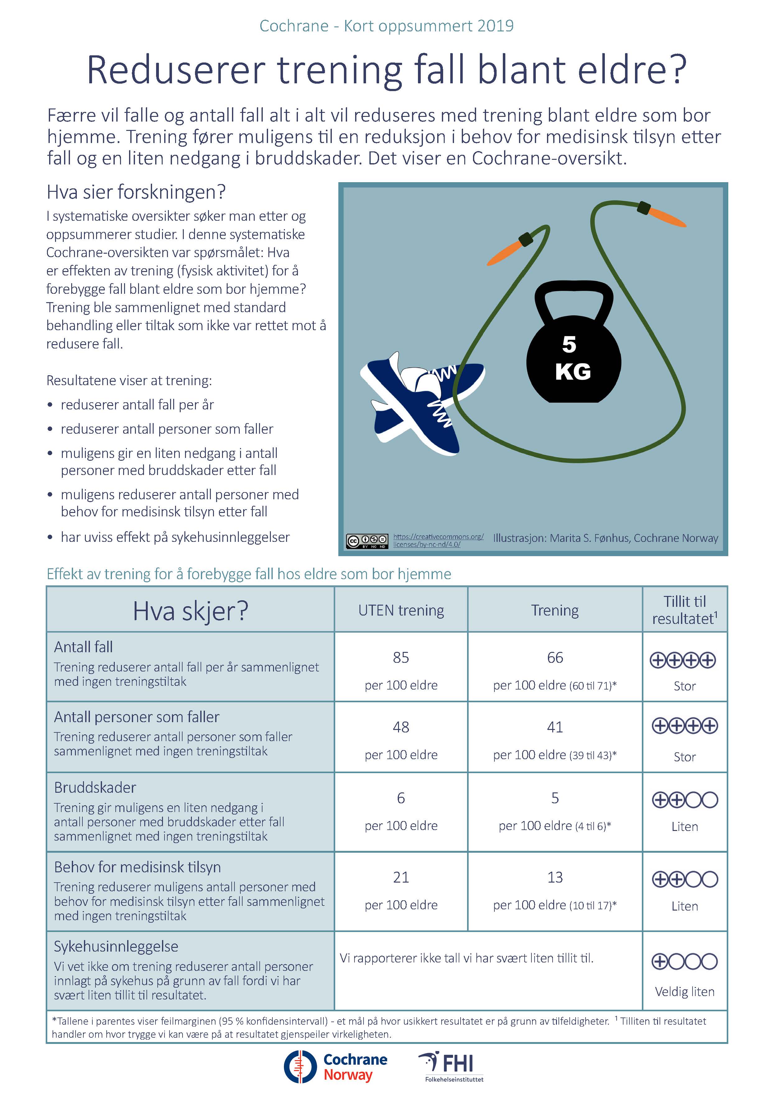 Færre vil falle og antall fall alt i alt vil reduseres med trening blant eldre som bor hjemme. Trening fører muligens til en reduksjon i behov for medisinsk tilsyn etter fall og en liten nedgang i bruddskader. Det viser en Cochrane-oversikt.