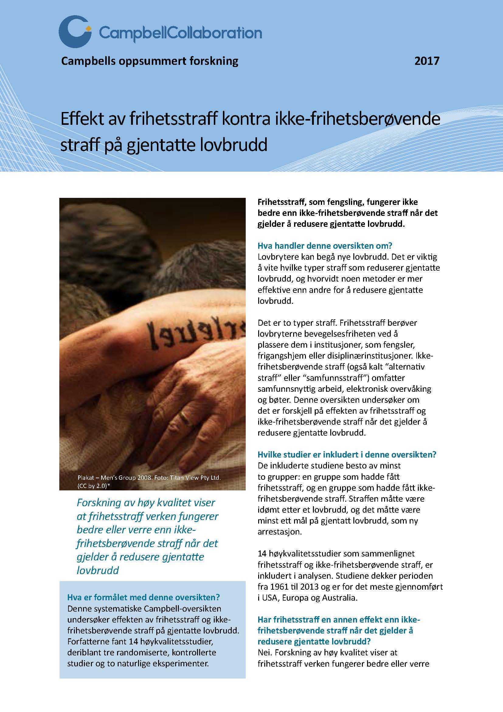 Denne systematiske Campbell-oversikten undersøker effekten av frihetsstraff og ikke-frihetsberøvende straff på gjentatte lovbrudd. Forfatterne fant 14 høykvalitetsstudier, deriblant tre randomiserte, kontrollerte studier og to naturlige eksperimenter.