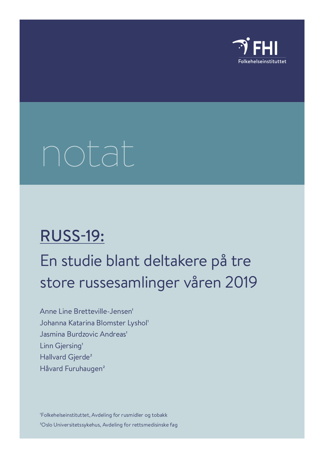 Denne studien undersøkte rusmiddelbruk og erfaringer på russetreff blant et utvalg på 1473 personer som var russ i 2019. Rusmiddelbruk ble målt ved spørreskjema og biologiske prøver (spyttprøve og alkometer) som inkluderte mål på siste timers alkoholinntak og inntak av cannabis, amfetamin, kokain og ecstasy. Biologiske prøver er et nyttig supplement til spørreskjema og gir objektiv informasjon om nylig bruk av lovlige og ulovlige rusmidler.