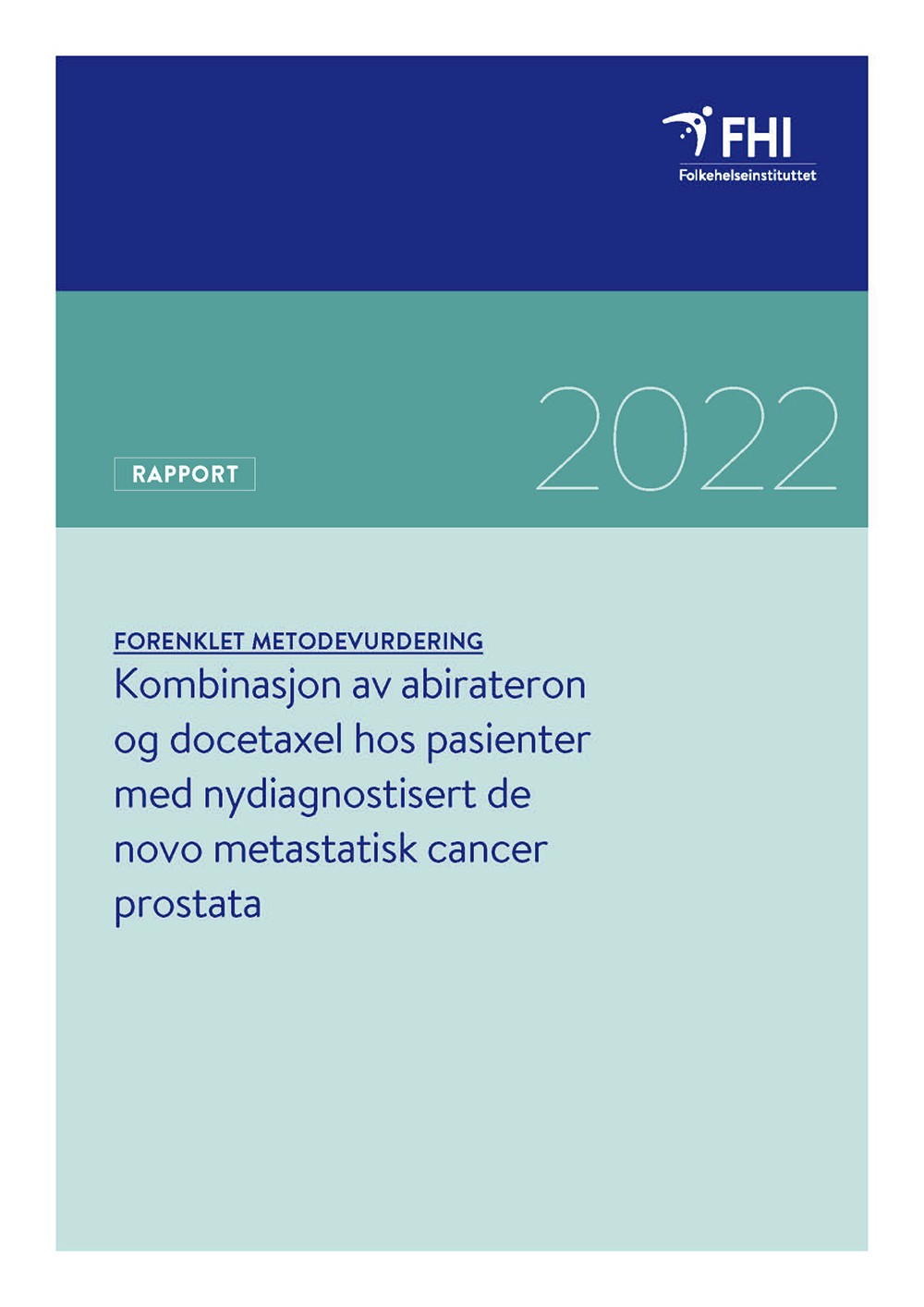 Område for helsetjenester, Folkehelseinstituttet, fikk i oppdrag av Bestillerforum for nye metoder å lage en forenklet metodevurdering om kombinasjon av abirateron og docetaxel i behandlingen av nydiagnostisert prostatakreft med spredning. Etter å ha gjennomført et systematisk litteratursøk viste det seg at bare fantes én studie som tilfredsstilte inklusjonskriteriene, og vi har derfor valg å presentere resultatene som en svært forenklet formidlingssak. Notatet er relevant for norske klinikere og beslutningstakere.