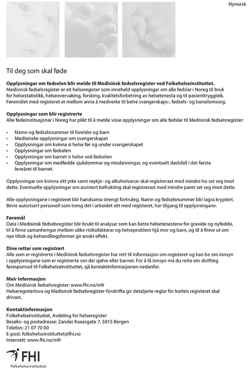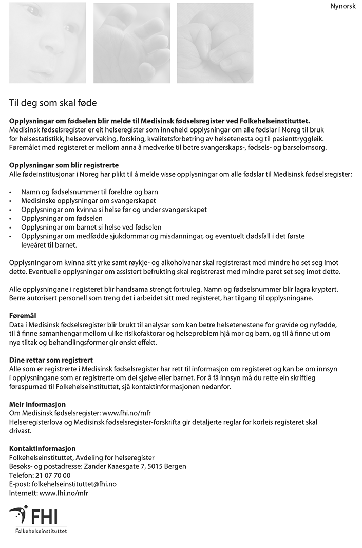 Informasjon til dei som skal føde om kva som blir registrert i Medisinsk fødselsregister og kva rettar ein har som registrert. Informasjonsskrivet blir delt ut på alle fødeavdelingane i landet.