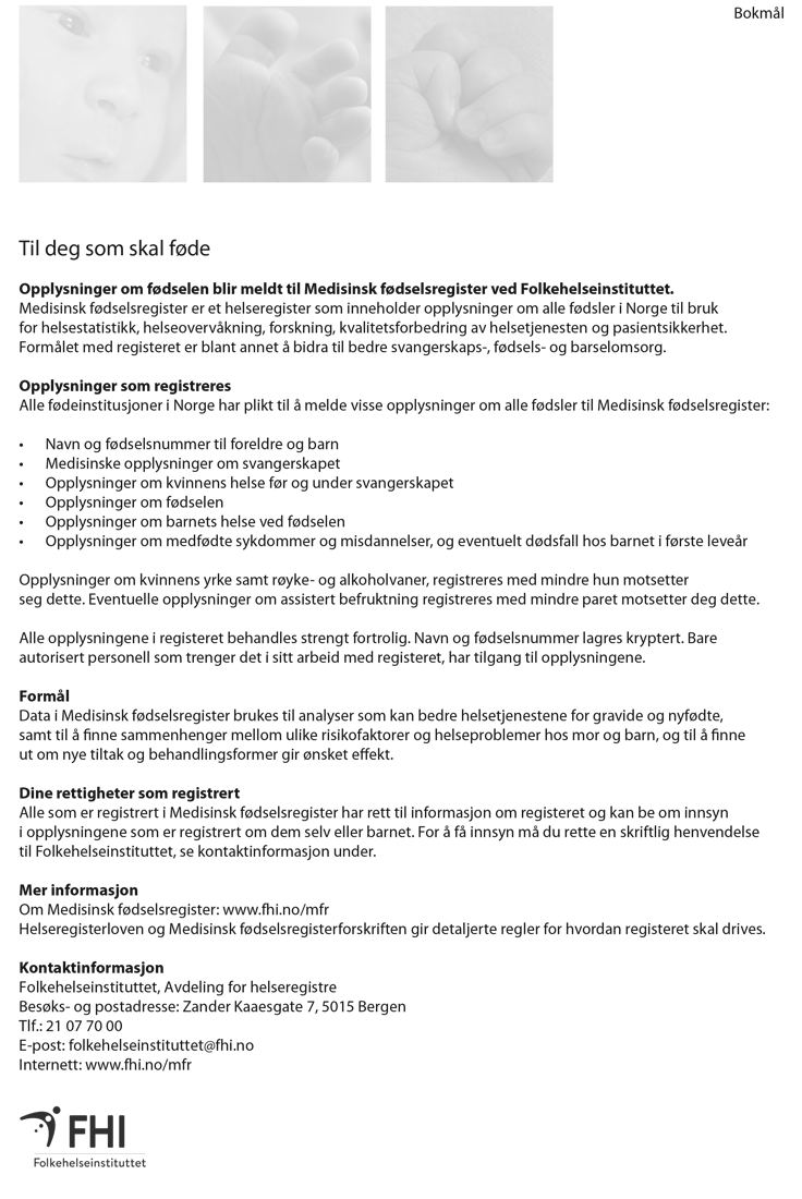 Informasjon til fødende om hva som registreres i Medisinsk fødselsregister og rettighetene til den som er registrert. Informasjonsskrivet deles ut på landets fødeavdelinger.