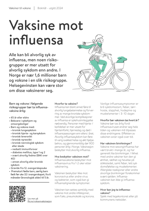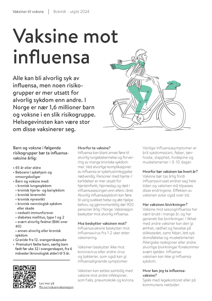 Informasjonsskriv om vaksine mot sesonginfluensa. Skrivet inneholder informasjon om risikogrupper og helsegevinster ved influensavaksinasjon.