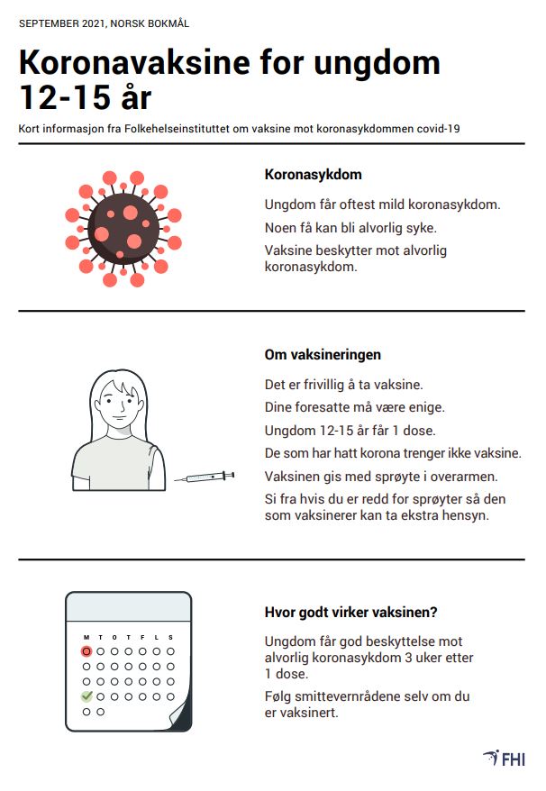 Kort informasjon frå Folkehelseinstituttet om vaksine mot koronasjukdommen covid-19 til ungdom 12-15 år.