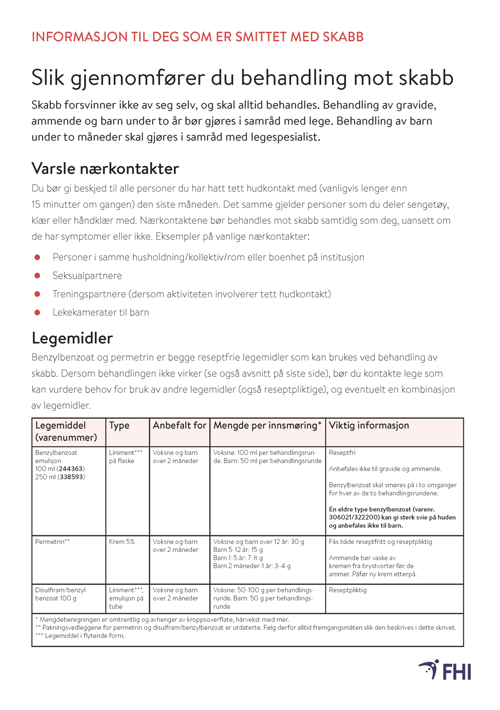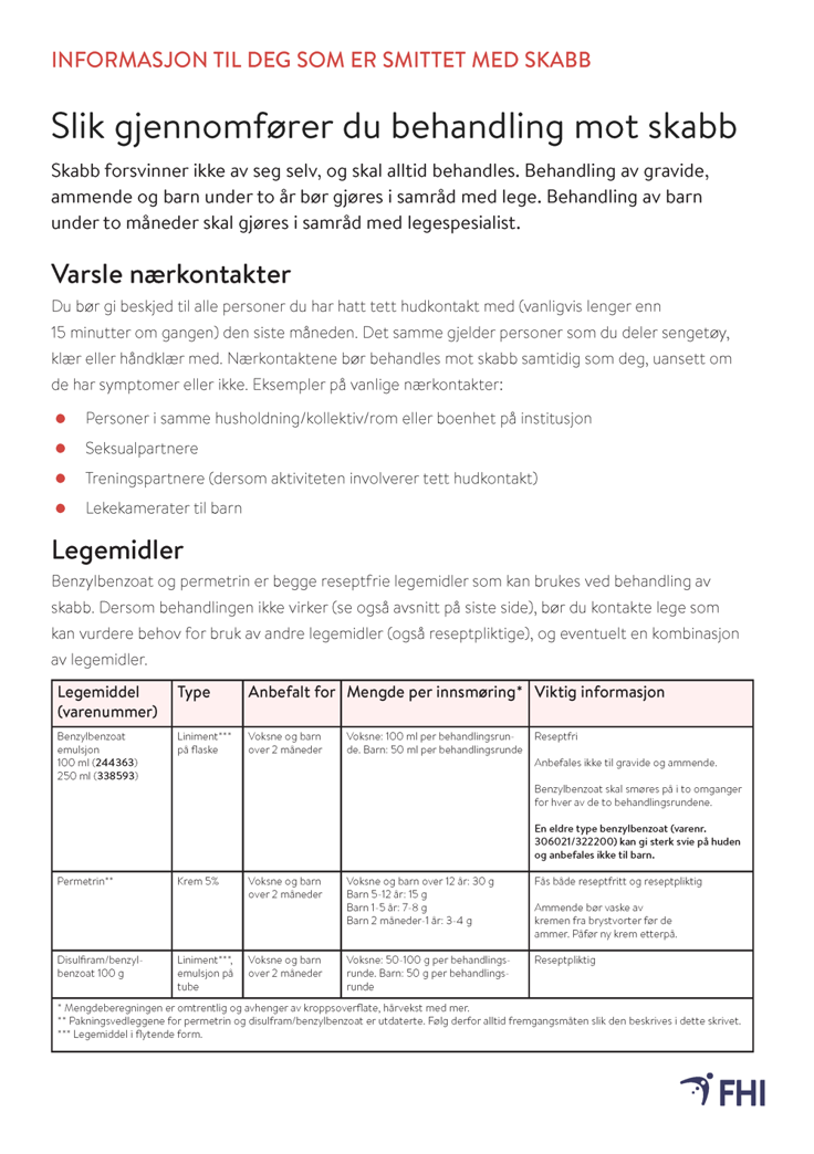 Skabb forsvinner ikke av seg selv, og skal alltid behandles. Behandling av gravide, ammende og barn under to år bør gjøres i samråd med lege. Informasjonsskrivet beskriver hvem du skal varsle og informere, hvilke legemidler som er tilgjengelig, steg-for-steg informasjon om hvordan behandlingen gjennomføres, hva du skal gjøre etter behandling og hva du gjør dersom behandlingen ikke virker.