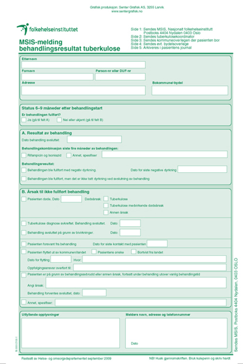 Dersom behandlingen av ulike grunner ikke avsluttes innenfor dette tidsrommet skal dette skjemaet sendes inn med angivelse av årsak til ikke fullført behandling. Nytt skjema sendes når behandlingen avsluttes. For multiresistent tuberkulose kan dette dreie seg om lenger tid. Skjemaet skal fylles og lages i fem kopier som sendes med vanlig post til de fem mottakerne som er anført øverst til venstre på skjemaet.