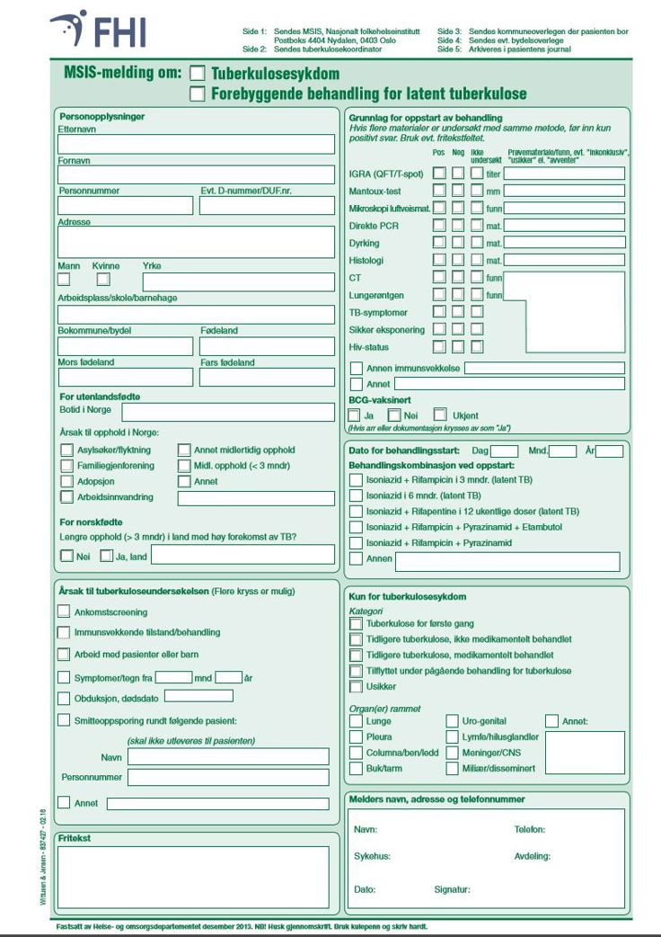 MSIS melding tuberkulose skal fylles ut av kliniker og sendes med vanlig post til MSIS med kopi til kommuneoverlege, tuberkulosekoordinator og pasientjournal når diagnosen tuberkuløs sykdom stilles og behandling startes. Oppstart av forebyggende behandling for latent tuberkuløs infeksjon (LTBI) skal meldes på det samme skjemaet. For melding av behandlingsresultat benyttes annet skjema.