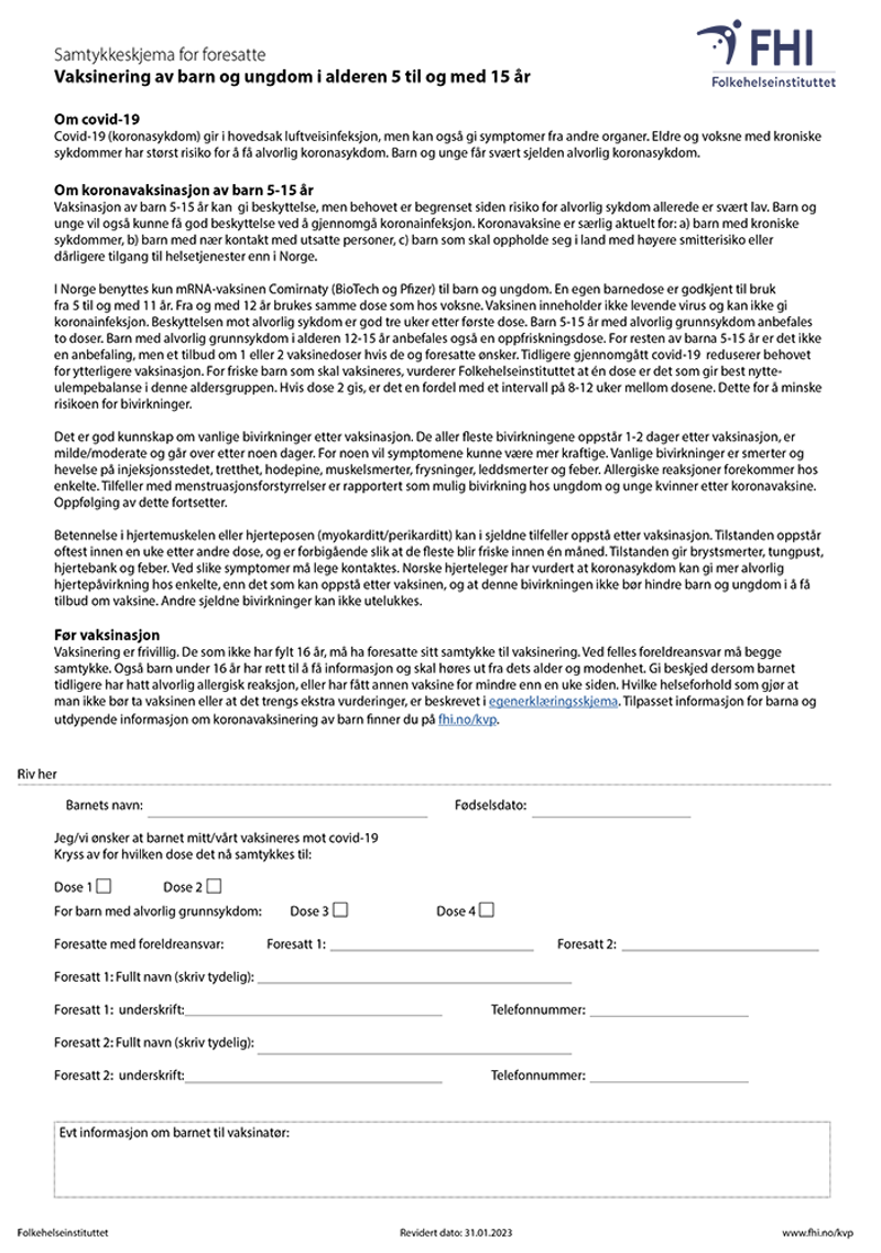 Samtykkeskjema - vaksinasjon av barn og unge i alderen 5 til og med 15 år