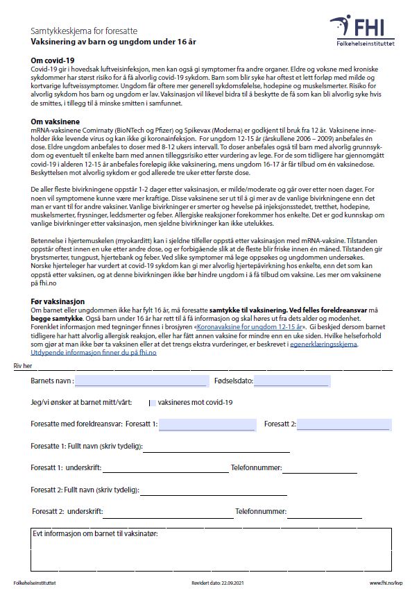 På denne siden finner du samtykkeskjema for koronavaksinasjon vaksinasjon av barn og unge i alderen 5 til og med 15 år.