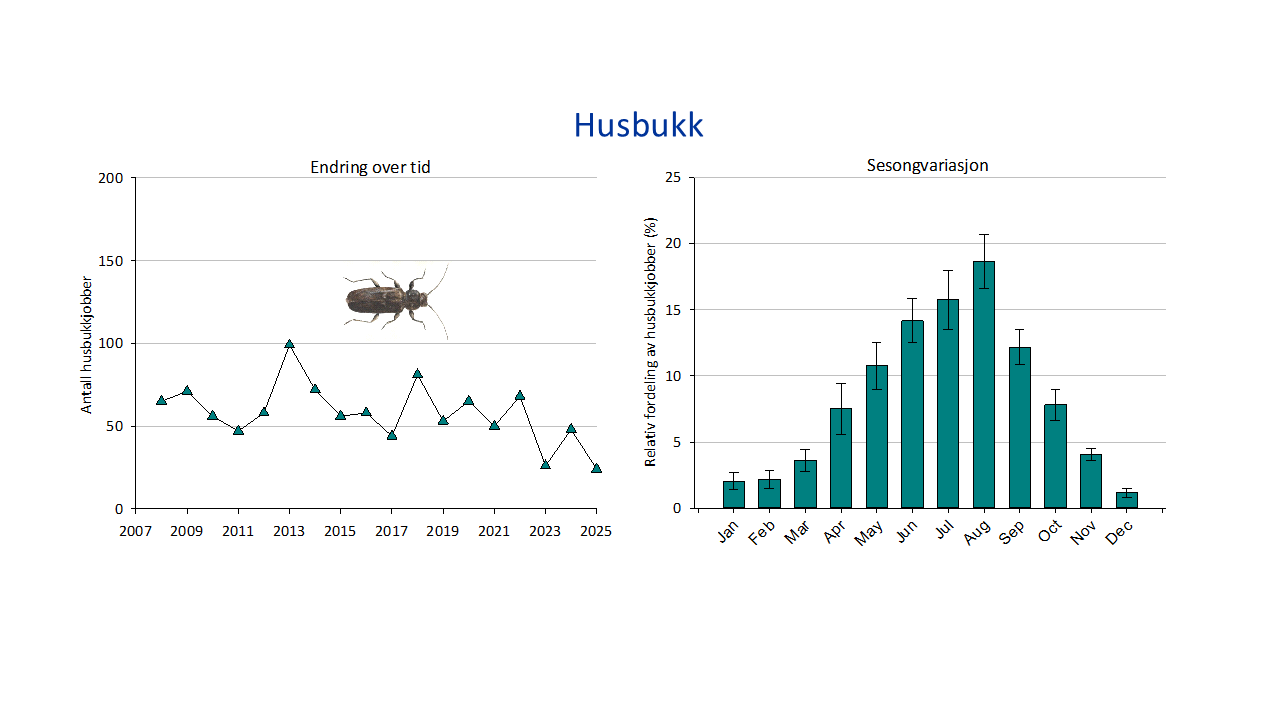 Husbukk er en trebukk, og larvene spiser tørt trevirke i bygninger. Den har sin hovedutbredelse langs kysten av Telemark og Agder, men finnes også innover i Telemark og flere fjorder på Vestlandet. Angrep av husbukk utvikler seg relativt sakte siden livssyklusen er lang. Det utføres under 100 bekjempelser per år, men bekjempelsene kan være arbeidskrevende med omfattende skader på bygningskonstruksjoner.