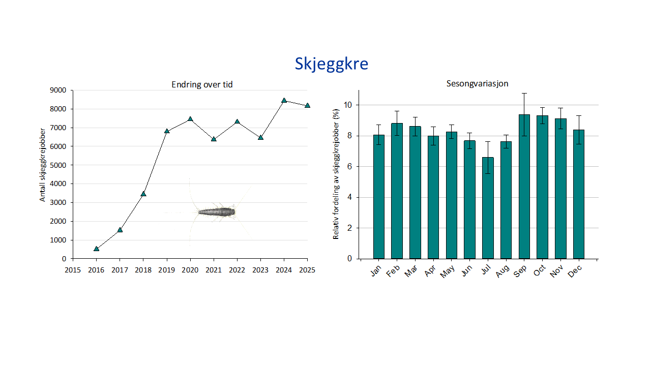 Skjeggkre er vingeløse, skjellkledde, mørkegrå og spraglete insekter som relativt nylig har etablert seg i Norge. De lever innendørs, ofte i nye bygninger, gjør lite fysisk skade, men oppleves av mange som sjenerende. Etter en kraftig økning i antallet bekjempelser fram til 2020, flatet veksten ut selv om det i 2024 var en viss økning fra foregående år. I 2025 sank antall bekjempelser litt.
