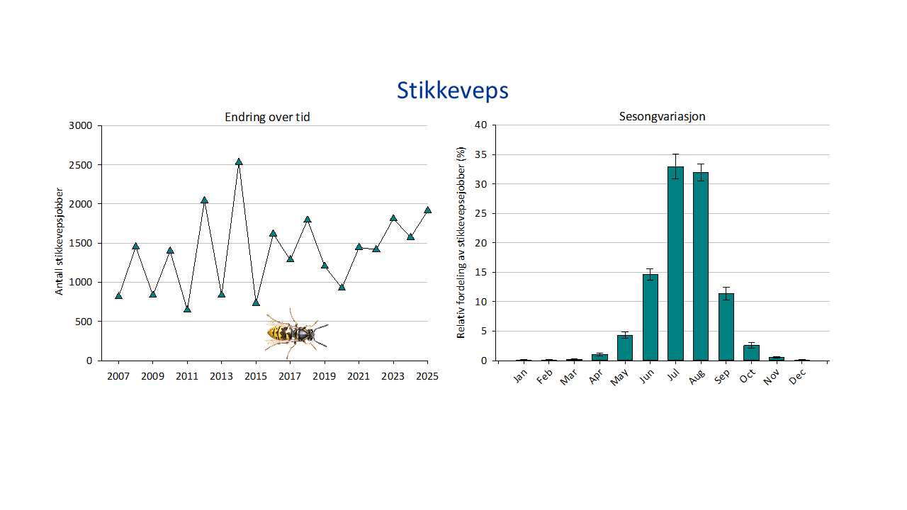 Stikkeveps er sosiale insekter som bor i en koloni i et vepsebol. Kolonien dør ut i løpet av høsten, og et vepsebol benyttes aldri om igjen. Stikkeveps finnes over hele Norge og er fryktet på grunn av sine vepsestikk. Antall bekjempelser i 2025 var omkring 1900 som kan betegnes som et vepseår med noe over gjennomsnittet i antall bekjempelser.
