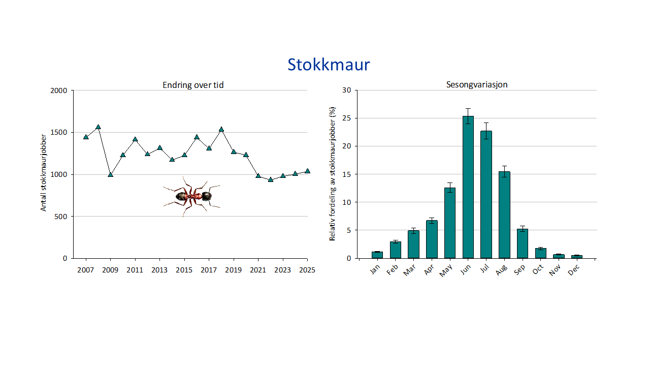 Stokkmaur finnes over store deler av Norge og er et av få insekter som kan gjøre skade på bygninger. Skaden kommer når mauren gnager ut tre eller isolasjonsmateriale for å anlegge reir. Bekjempelse av stokkmaur har holdt seg på et stabilt nivå rundt 1000 bekjempelser de siste fem årene.