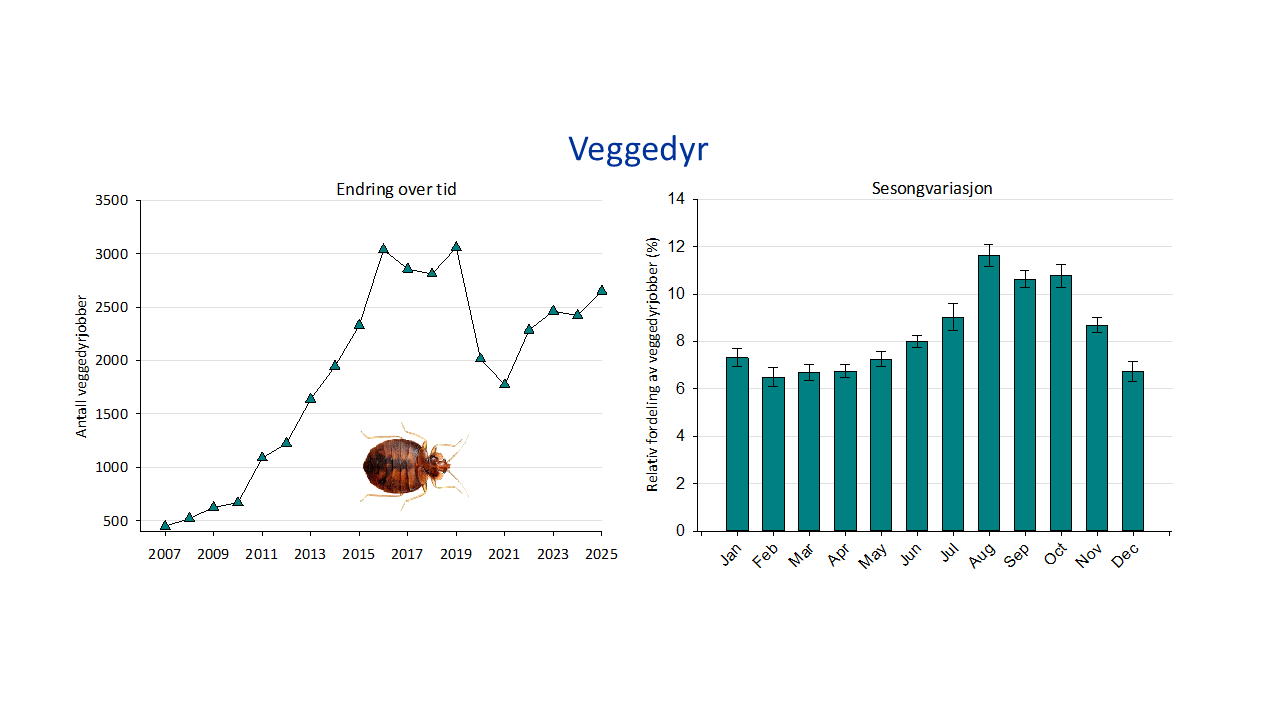 Veggedyr er et blodsugende insekt som er tett knyttet til mennesker. På grunn av resistens mot insektmidler og økt reiseaktivitet steg forekomsten av veggedyr kraftig over store deler av verden etter år 2000. Dette så vi også i Norge fram til 2016 da antallet stabiliserte seg noen år før det ble en kraftig nedgang under koronapandemien. Etter pandemien har det igjen vært en økning i antall bekjempelser selv om dette ikke har nådd helt opp til antallet før denne. Det er generelt en økning av veggedyrbekjempelser hver høst i etterkant av ferier, som peker på viktigheten av reiseaktivitet for spredning av veggedyr også i Norge.