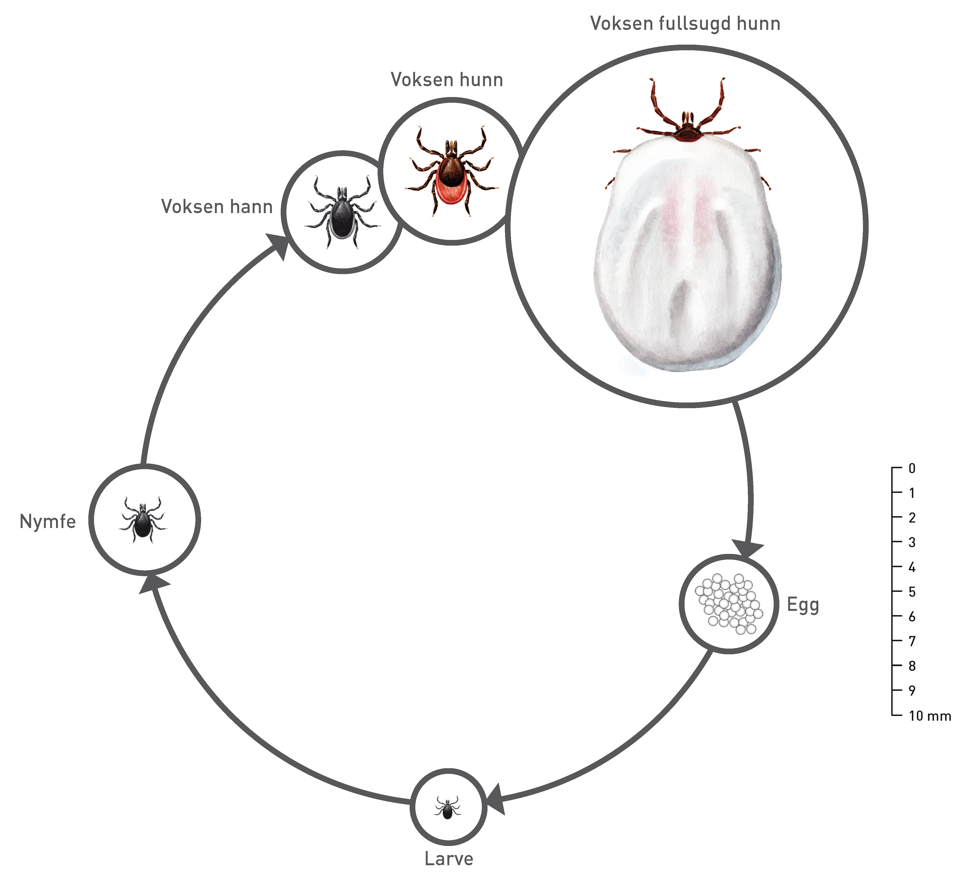 Her vises utviklingsstadiene larve, nymfe og voksen hann og hunn FHI - Heidi Lindstedt