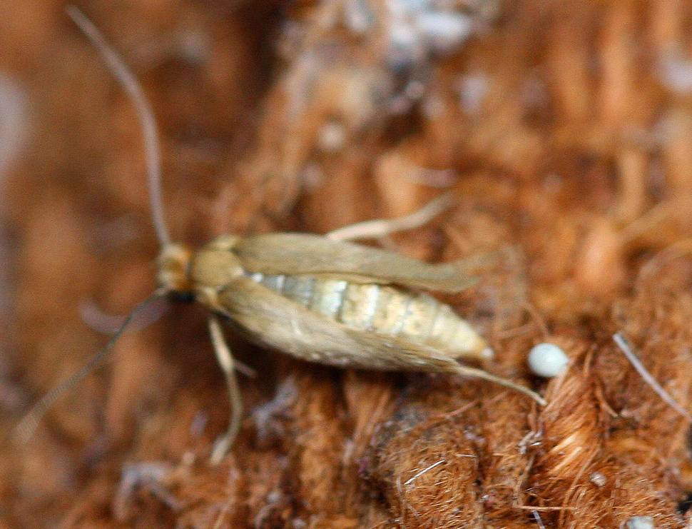 Eggene legges i sprekker og folder i tøy eller ved basis av hårene i pelsverk (Fig. 3). Når de ikke er godt festet til underlaget, kan eggene lett ristes vekk. Dersom de er lagt innimellom fibre, så kan dette imidlertid være vanskeligere (9). En hunn legger i gjennomsnitt rundt 50 egg i de to til tre ukene som voksne møll lever (1,6,7,10). Tiden det tar før egget klekkes er 14 dager ved 18 ºC, 7 dager ved 24 ºC og 5 dager ved 30 ºC (11).