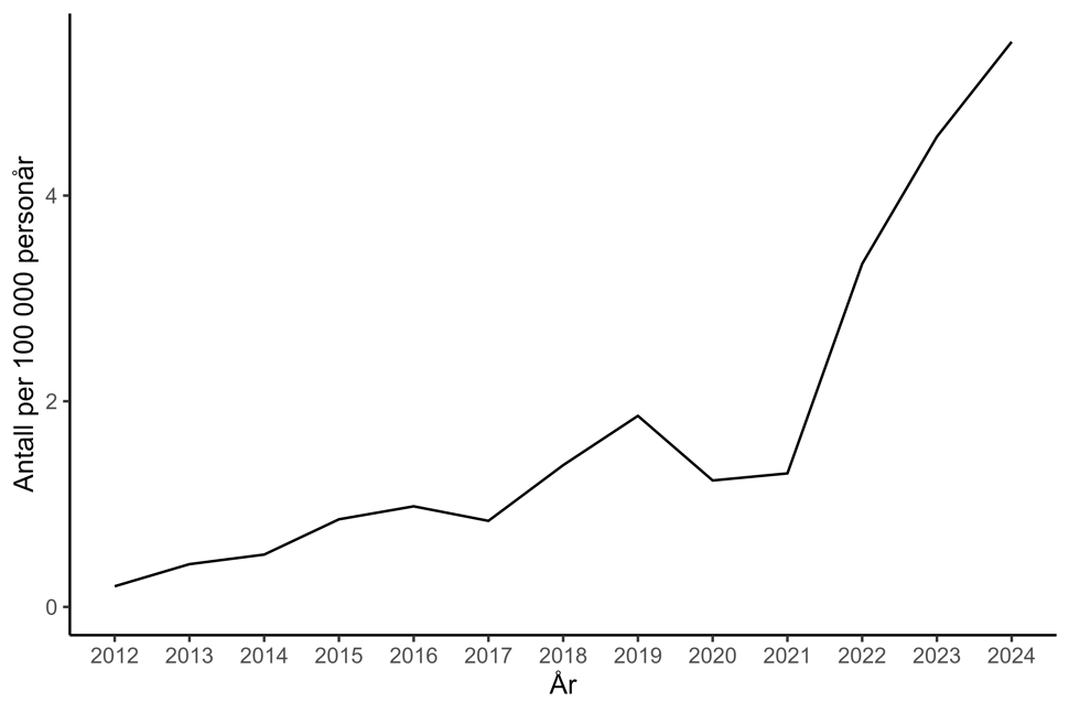 Figur 2. Antall personer per 100 000 personår med CPO meldt til MSIS i perioden 2012-2024. Kilde: MSIS, FHI.