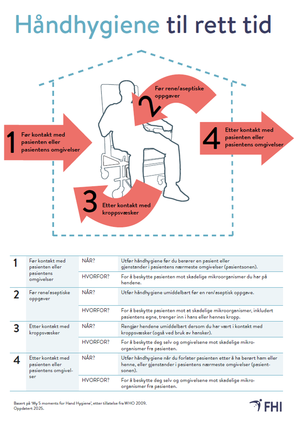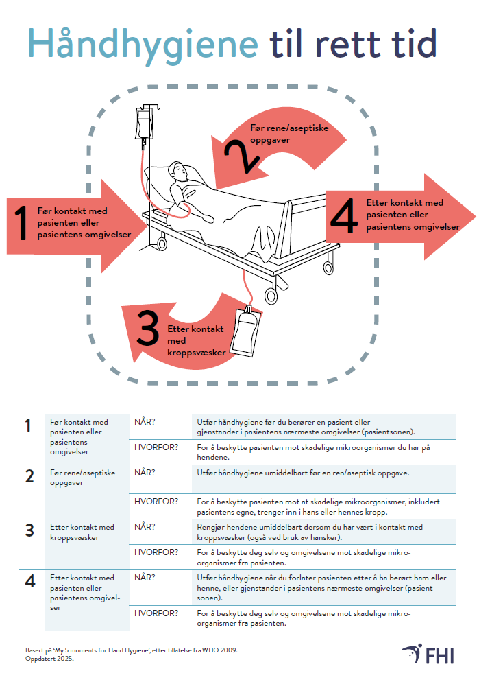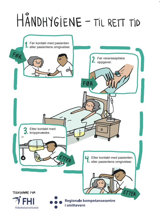 Hensikten med plakatene/illustrasjonene under er å visualisere når håndhygiene bør utføres i helsetjenesten. Under illustrasjonene er det en tabell som besvarer hver anledning med når og hvordan. Plakatene er utarbeidet for å brukes til opplæring i håndhygiene og som oppslag for en påminnelse på når håndhygiene skal utføres.