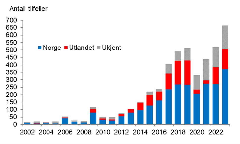 EHEC kan ha nesten hvilken som helst serogruppe og stadig flere subtyper av stx2 oppdages (8). Serogruppene O157 og O26 er de vanligste EHEC-serogruppene som har blitt påvist i Norge de 10 siste årene (2014-2023). Andre vanlig påviste serogrupper er O103, O145 og O146. For barn som har HUS assosiert med diaré, regner man med at omtrent 90 % skyldes EHEC-infeksjon. Det kan ofte være vanskelig å påvise bakterien, spesielt hvis prøven tas sent i sykdomsforløpet. Stx-genene er lokalisert på bakteriofager (små viruspartikler) som kan tapes og erverves (10). Ved alvorlig klinikk (HUS eller mistanke om HUS) bør derfor diagnostikken ta utgangspunkt i påvisning av både stx- og eae-gener. I helt spesielle tilfeller, etter en sammenholdt vurdering av analyseresultater fra Nasjonalt referanselaboratorium, klinikk og epidemiologisk situasjon, kan en eae-positiv stamme der man ikke finner stx-gener bli klassifisert som høyvirulent EHEC. I de ytterst få tilfellene der det er aktuelt, vil dette bli kommunisert til den aktuelle kommuneoverlegen som følger opp smitteverntiltakene.