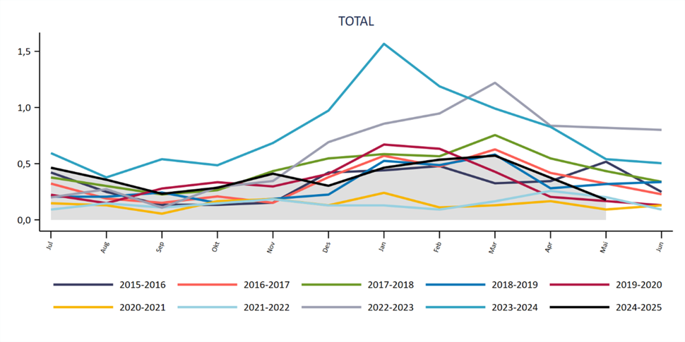 Figur 2. Månedlige trender i forekomsten av iGAS per 100 000 innbyggere i Norge fra juli 2015 – mai 2025. Y-aksen viser antall iGAS tilfeller per 100 000. Kilde: MSIS